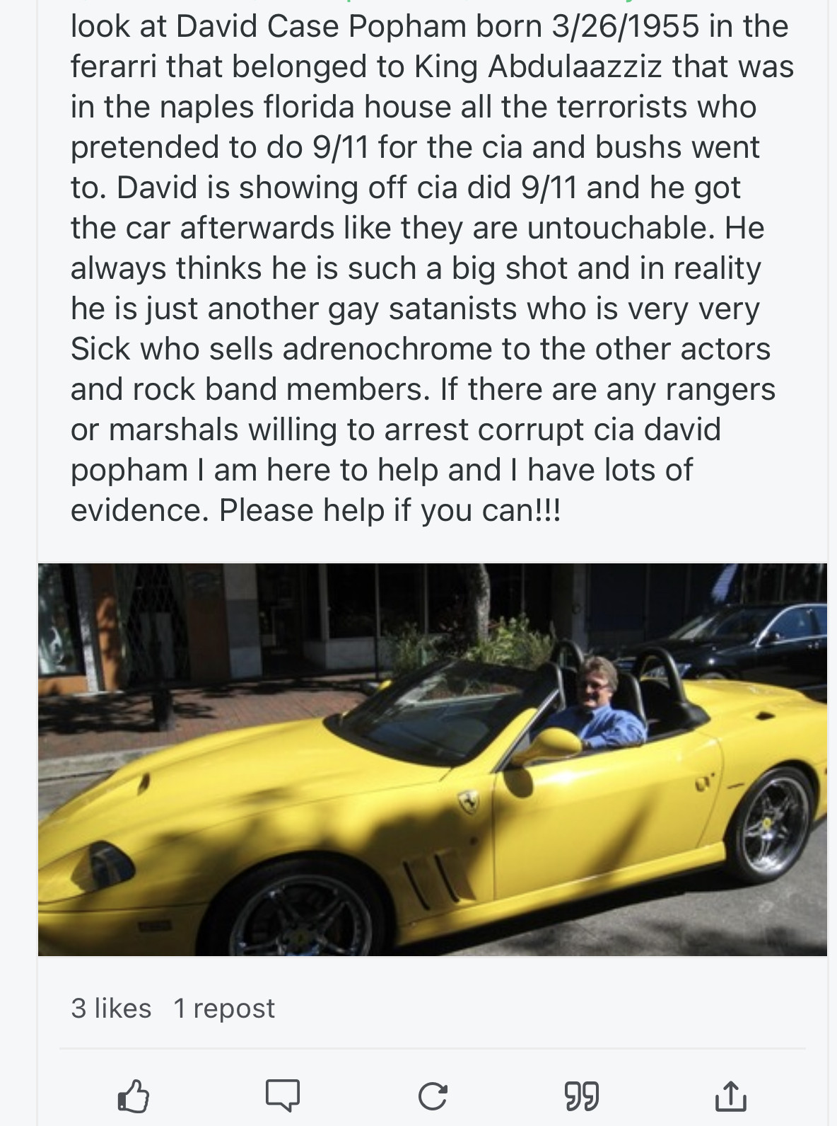 Lin, my uncle is corrupt cia and sells adrenochrome from torturing children. Can I get him his military tribunal he deserves. I have evidence. He is david case popham born 3/26/1955 and he sprays anesthesia on people so they never know they saw him. Pure Evil. He has a house full of extortion videos and the master is dead bolted to lock children up at 10920 SW 177 Terr in Miami, Florida 33157 and the house belongs to his boyfriend walter fraser. Please arrest them both. Since they are corrupt cia I cannot find LE that will arrest them. I need military help to protect my step brothers who ar...