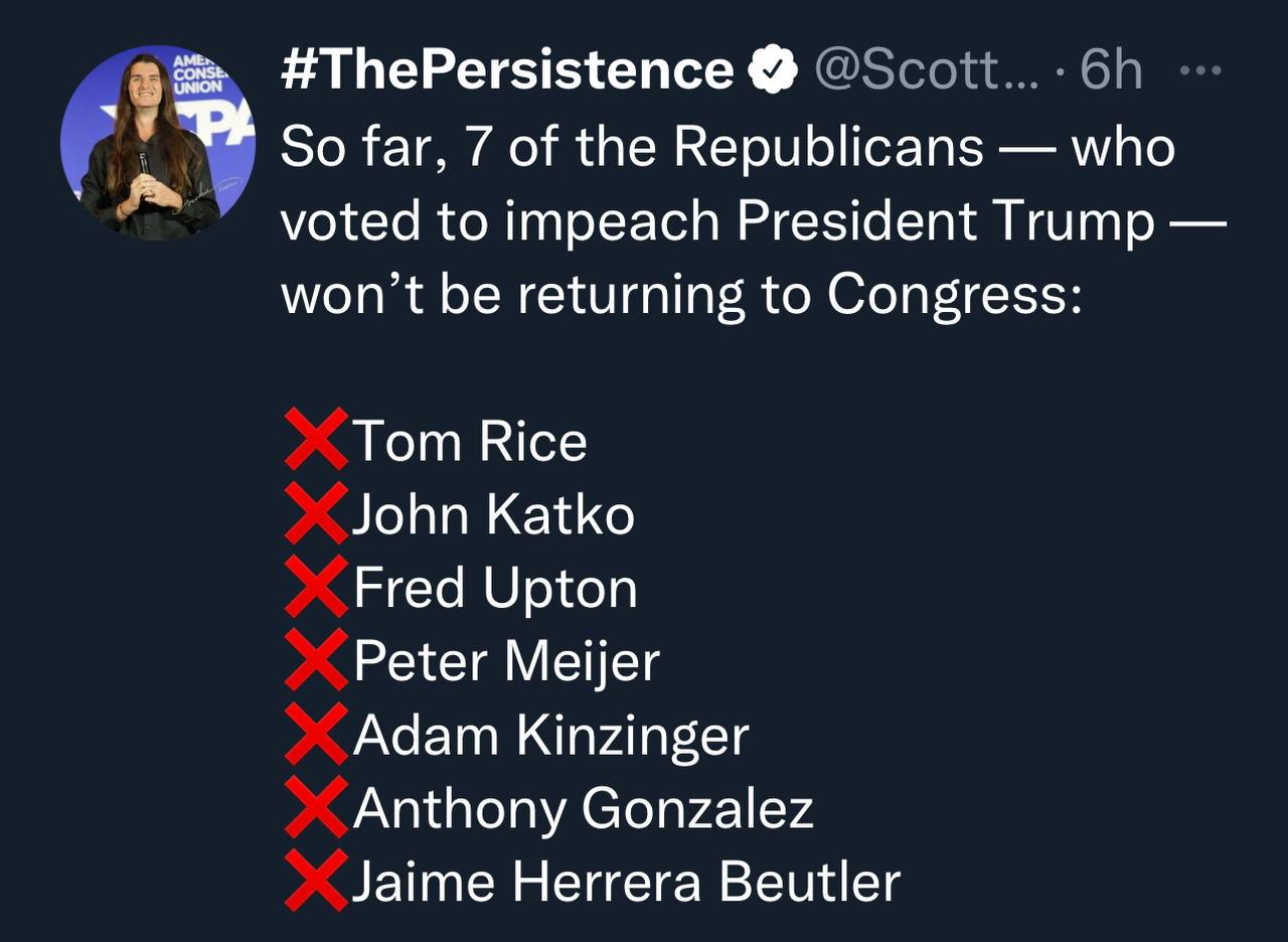 Falling like flies... And all but one lost their Primary to TRUMP endorsed opponents, the one in "California" had NO TRUMP endorsed opponents. More to come....