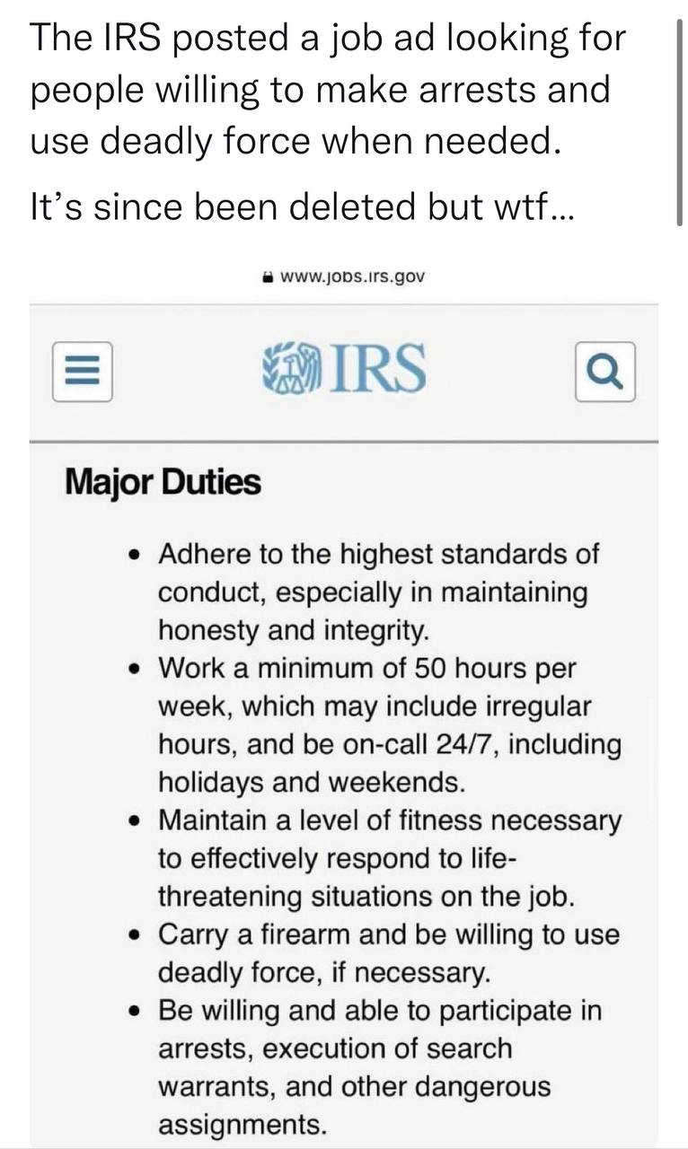 Requirements include working min “50 hours per week, which may include irregular hours, and be on-call 24/7, including holidays and weekends” and “Carry a firearm and be willing to use deadly force, if necessary.”