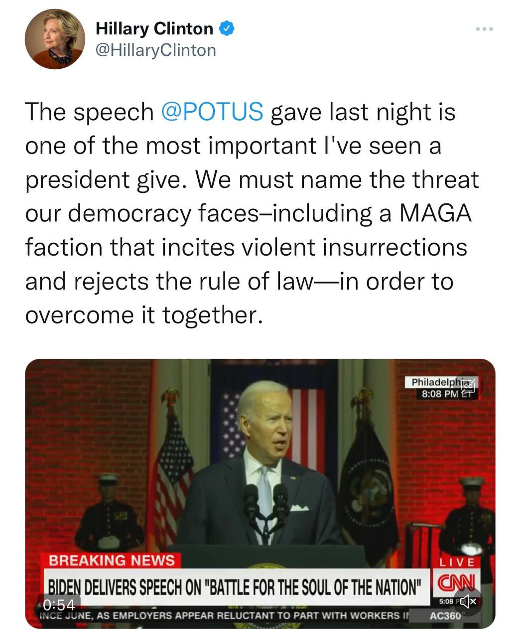 Hillary Clinton thinks that Biden’s speech last night was “one of the most important” speeches ever given by a president.